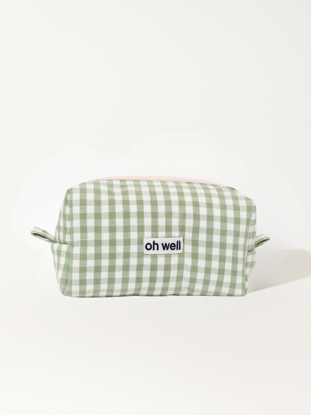Feita em tecido resistente, com forro interno e zíper de metal, ela tem o tamanho ideal pra levar seus produtos oh well com praticidade e estilo. O destaque fica por conta da estampa vichy verde e o zíper rosa bebê, que traz um ar delicado e retrô.